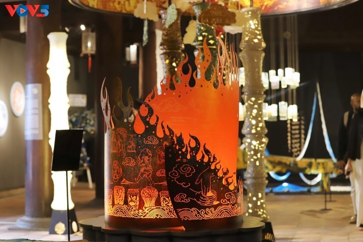 La exposición presenta diez obras de nueve artistas creadas y dispuestas en una amplia variedad de estilos y materiales. (En la foto: La obra “Luz celestial” de Nguyen Tuan Dung). |