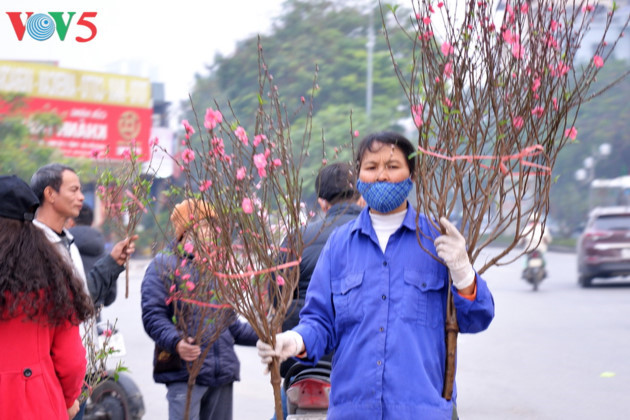 Los vendedores de ramas de melocotón emprenden sus negocios desde temprano por la mañana, especialmente en los ejes cercanos a las aldeas de floricultura como Nhat Tan, Tay Ho y Lac Long Quan. |