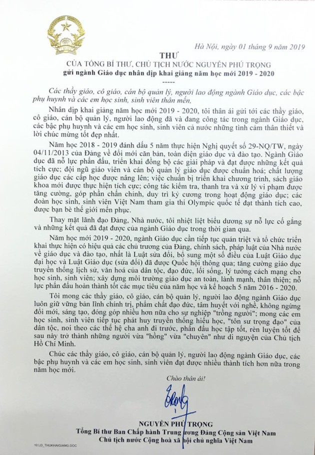 La carta del secretario general del Partido Comunista y presidente de Vietnam, Nguyen Phu Trong, enviada a los profesores y estudiantes con motivo del inicio del nuevo año escolar (5 de septiembre). |