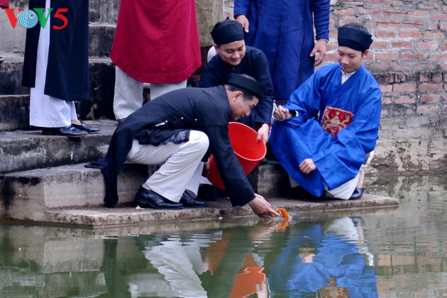 Después de rendir tributo a los Ong Cong y Ong Tao tiene lugar la ceremonia de liberar a los peces. Según la creencia, a través de ellos esos seres divinos llegan al Reino Celestial para reportar al Embajador de Jade sobre lo realizado por cada familia durante el año. |