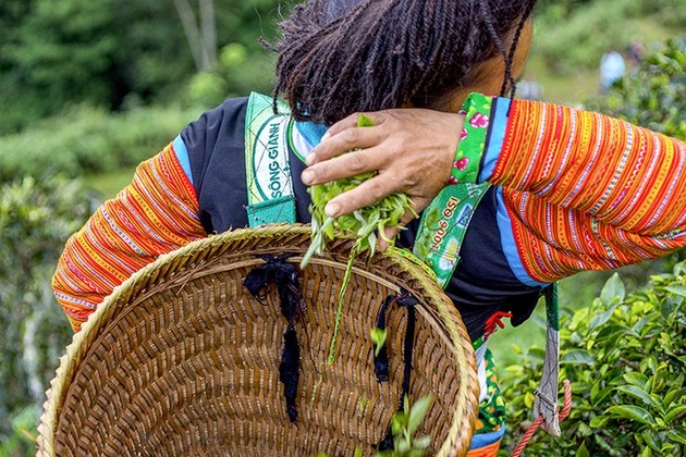 Para cosechar los capullos de té de Shan Tuyet, las personas suben a los árboles, recogen los capullos de té uno por uno, y los coloca en una canasta sobre su espalda. (Foto: VOV) |