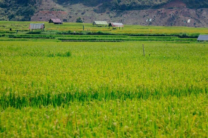 A partir de finales de mayo, las terrazas de arroz de la aldea de Kon Tu Rang (distrito de Kon Plong, provincia de Kon Tum) cambian de color, exhibiendo una imagen dorada brillante. Foto: Hi Mang Den. |