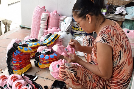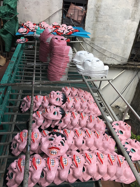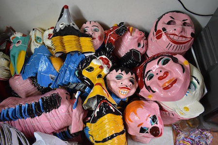 El estrecho espacio de su casa está lleno de máscaras y materiales. El lugar donde los artesanos hacen este tipo de juguete tradicional es solo un pequeño corredor. |