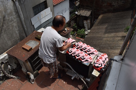 Según el señor Hoa (64 años de edad), una máscara de cartulina debe pasar muchos pasos. Primero, hay que acumular los papeles. Luego, estos son cortados en trozos pequeños para poner capas sobre capas en los moldes de cemento prefabricados en forma de caras alegres. Los artesanos lo aplanan presionando y lo preparan para darle la figura exacta que desean. Después, lo sacan del molde, que ahora se llama embrión, y lo colocan al sol durante días para dejarlo secar y garantizar su calidad. |