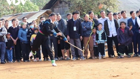 (VOVWORLD) - Cuando llega el Tet, o Año Nuevo lunar tradicional, la gente de la etnia Mong se emociona por sus festivales tradicionales, en los que se deleitan con juegos folclóricos. Conservado como una característica cultural única de los Mong, Tu Lu, una versión tradicional de los trompos, es el más popular. Aunque es fácil de jugar, requiere que los jugadores tengan buena fuerza física, ingenio y precisión.
