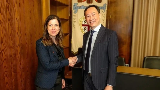 El embajador de Vietnam en Italia, Duong Hai Hung, y Alessandra Todde, presidenta de la región de Cerdeña. (Foto: VNA) |