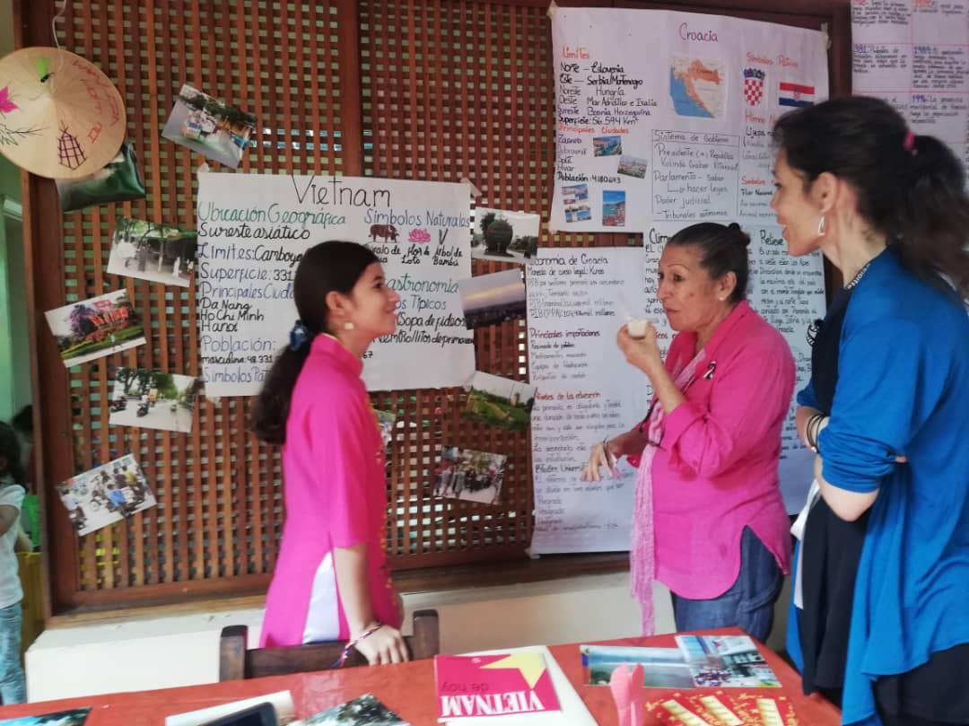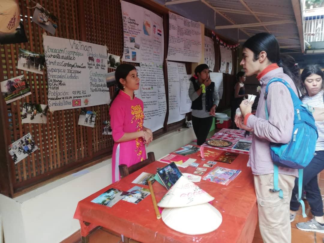 Ataviada a lo vietnamita, con su vestido Ao Dai y el tradicional sombrero cónico (Non), la jovencita caraqueña sobresalió de los restantes expositores, que en su mayoría hablaron sobre países latinoamericanos.