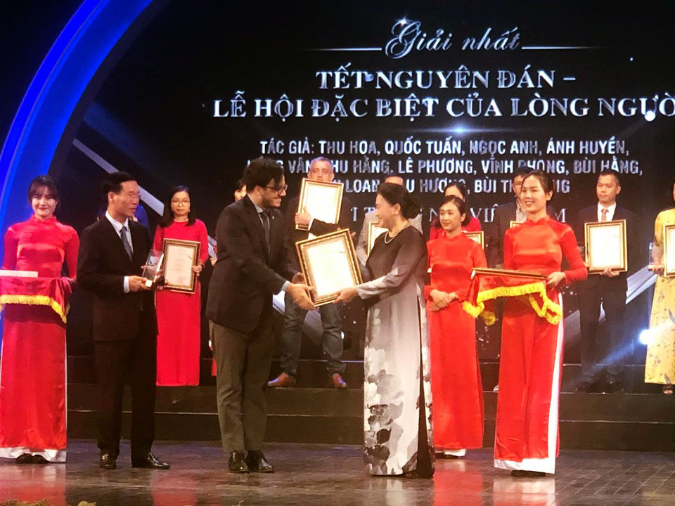El jefe de Sección Consular, Cultural y de Prensa de la Embajada de Argentina en Hanói, Francisco Martín Lobo (i), en representación de los autores ganadores de su país, recibe el máximo galardón del Premio Nacional de Información al Exterior 2019 entregado por la presidenta del Parlamento de Vietnam, Nguyen Thi Kim Ngan (Foto: VOV5) |