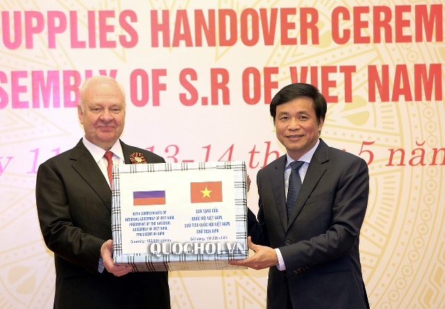 El secretario general de la Asamblea Nacional de Vietnam, Nguyen Hanh Phuc (d), entrega suministros médicos al embajador de la Federación de Rusia en el país, Konstantin Vasilievich Vnukov (Foto: quochoi.vn) |