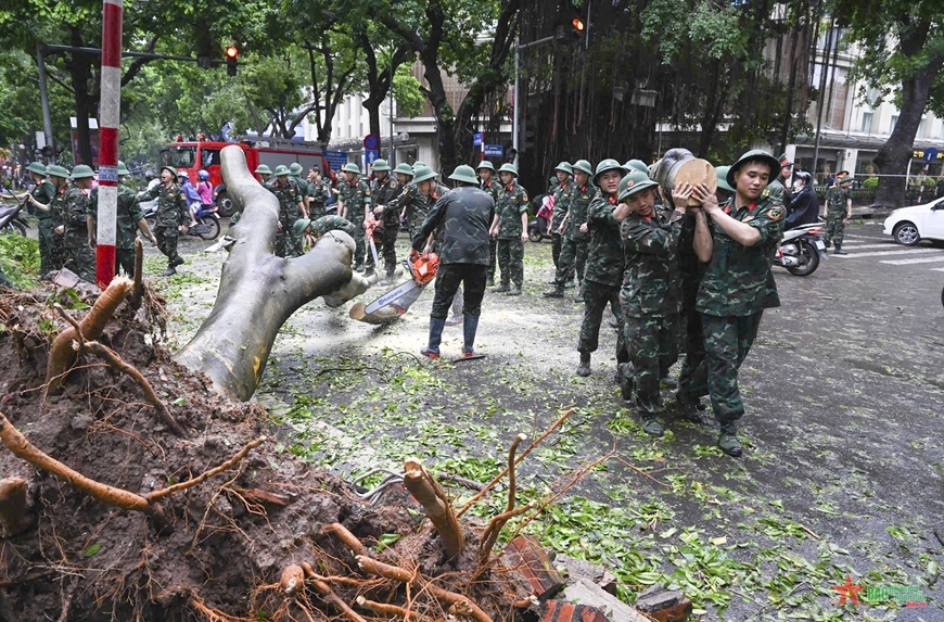 Fuerzas militares limpian los árboles caídos en una calle de Hanói tras el paso del tifón Yagi. (Foto: qdnd.vn) |
