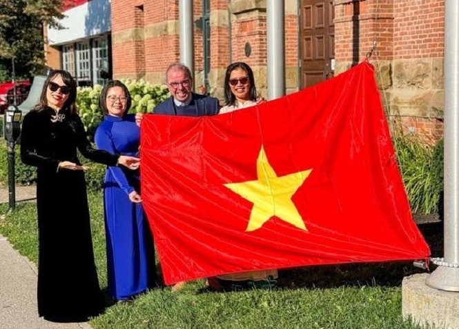 En esta ocasión, la comunidad vietnamita en algunas partes de Canadá realizó una ceremonia de izamiento de la bandera en los ayuntamientos de donde viven. En Ottawa, ayer, representantes del Comité Ejecutivo de la Sociedad Canadá-Vietnam (CVS) y algunos compatriotas, celebraron una ceremonia de izamiento de la bandera, dejando ondear la bandera nacional frente al Ayuntamiento junto con la bandera de Canadá. Esta fue la primera vez que la diáspora vietnamita en Ottawa presenció la bandera roja con la estrella dorada flameando en una instalación administrativa estatal canadiense en la fecha patria.