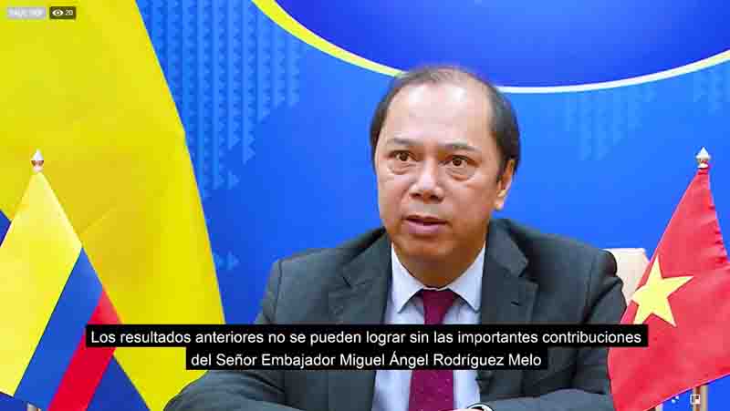 El embajador Miguel Ángel Rodríguez Melo destacó: “Colombia es el quinto socio comercial de Vietnam en Sudamérica. En el año 2019, el monto del comercio bilateral fue de 685 millones de dólares y en el año 2020 fue de 640 millones de dólares. Ambos países hemos trabajado conjuntamente para otorgar más posibilidades y oportunidades a nuestros productos, especialmente en el sector agropecuario. En educación destacó el programa del español para funcionarios del Gobierno de Vietnam cuya primera fase se extendió desde el año 2013 a 2018, y la segunda inició en el año 2019 con la participación de 58 estudiantes. Este año, el curso de español se realizará en el segundo semestre y esperamos la participación de 25 estudiantes”.