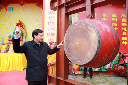 El presidente del Comité Popular de Quang Ninh, Nguyen Duc Long, toca el tambor dando inicio al Festival de Yen Tu 2016 |