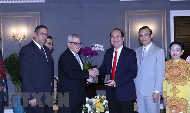 Nguyen Ho Hai, secretario adjunto del Comité del Partido Comunista de Vietnam en Ciudad Ho Chi Minhm (c.), recibe al secretario general de la Asamblea Nacional del Poder Popular y del Consejo de Estado de Cuba, Homero Acosta Álvarez. (Foto: VNA) |
