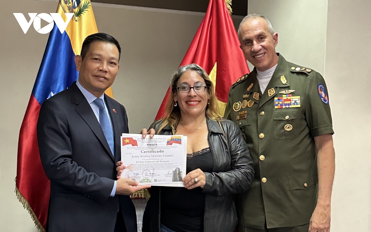 Felicitó a los alumnos por completar los cursos y expresó su esperanza de que ayuden a presentar los platos típicos y el icónico baile "non" de Vietnam al pueblo venezolano.