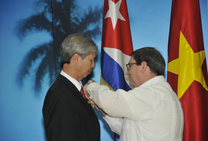 Un brillo intenso y una humedad inusual asomaron en los ojos del homenajeado, quien guardó silencio mientras el canciller cubano Bruno Rodríguez Parrilla le colocaba el galardón en el pecho, en reconocimiento a lo mucho que hizo para lograr que, además de indestructibles y hermosos, los nexos políticos económicos y comerciales entre las tierras de Fidel y de Ho Chi Minh fueran como son hoy: más amplios, dinámicos y diversos.