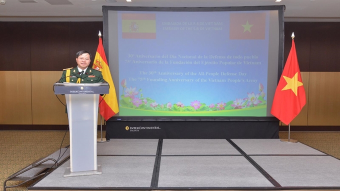 Durante la ceremonia, el coronel Bui Xuan Phong, agregado militar de Vietnam en España, revisó la historia y el proceso de crecimiento del Ejército Popular del país en los últimos 75 años, que siempre acompaña la causa revolucionaria nacional, desde la lucha por la independencia y la reunificación en el pasado hasta la empresa de construcción y desarrollo nacional y la protección soberana en la actualidad. Además, reiteró los esfuerzos de las Fuerzas Armadas vietnamitas para ampliar los nexos y promover su integración internacional, en particular a través de su participación en las misiones de paz de la ONU.