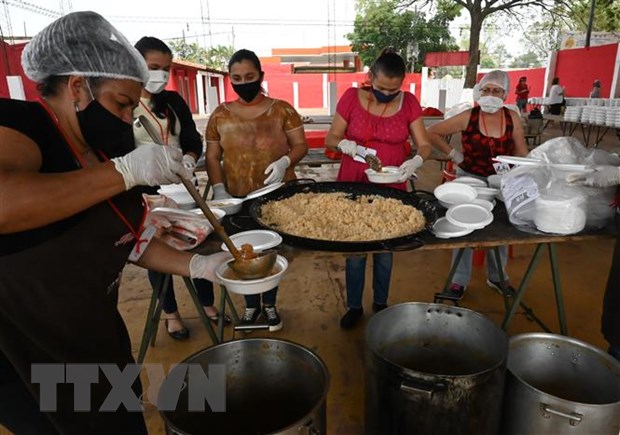 Voluntarios distribuyen comidas gratuitas a las personas en situación difícil en Asunción, Paraguay, el 11 de septiembre de 2020, en medio del covid-19. (Foto: AFP/VNA) |