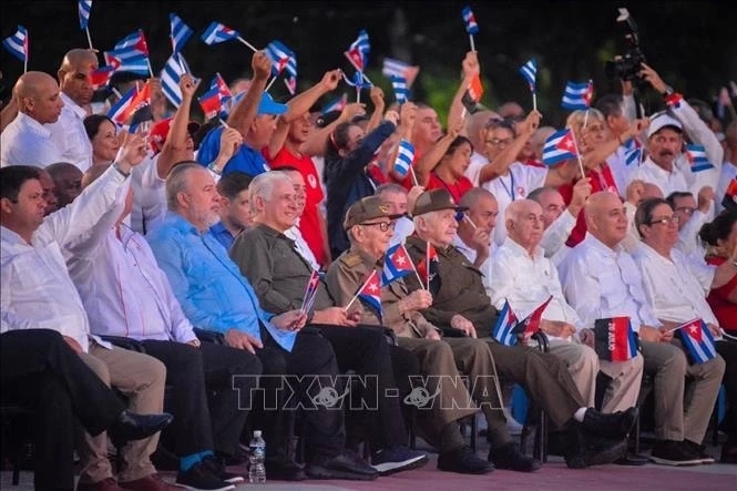 El General de Ejército Raúl Castro Ruz (primera fila, quinto desde la izquierda) y el primer secretario del Comité Central del Partido Comunista y presidente de Cuba, Miguel Díaz-Canel Bermúdez (primera fila, cuarto desde la izquierda), en un acto celebrado en la Plaza de la Revolución Máximo Gómez Báez, en Ciego de Ávila. (Foto: VNA) |