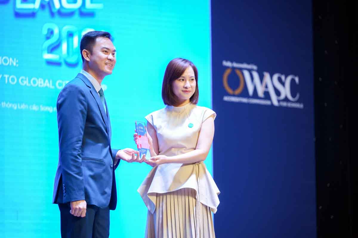 El doctor Nguyen Vinh Son, director general de Wellspring Hanoi, entrega un sello conmemorativo a la oficial de Educacion de UNICEF Viet Nam, Vu Kim Chi. (Foto: Wellspring Hanoi) |
