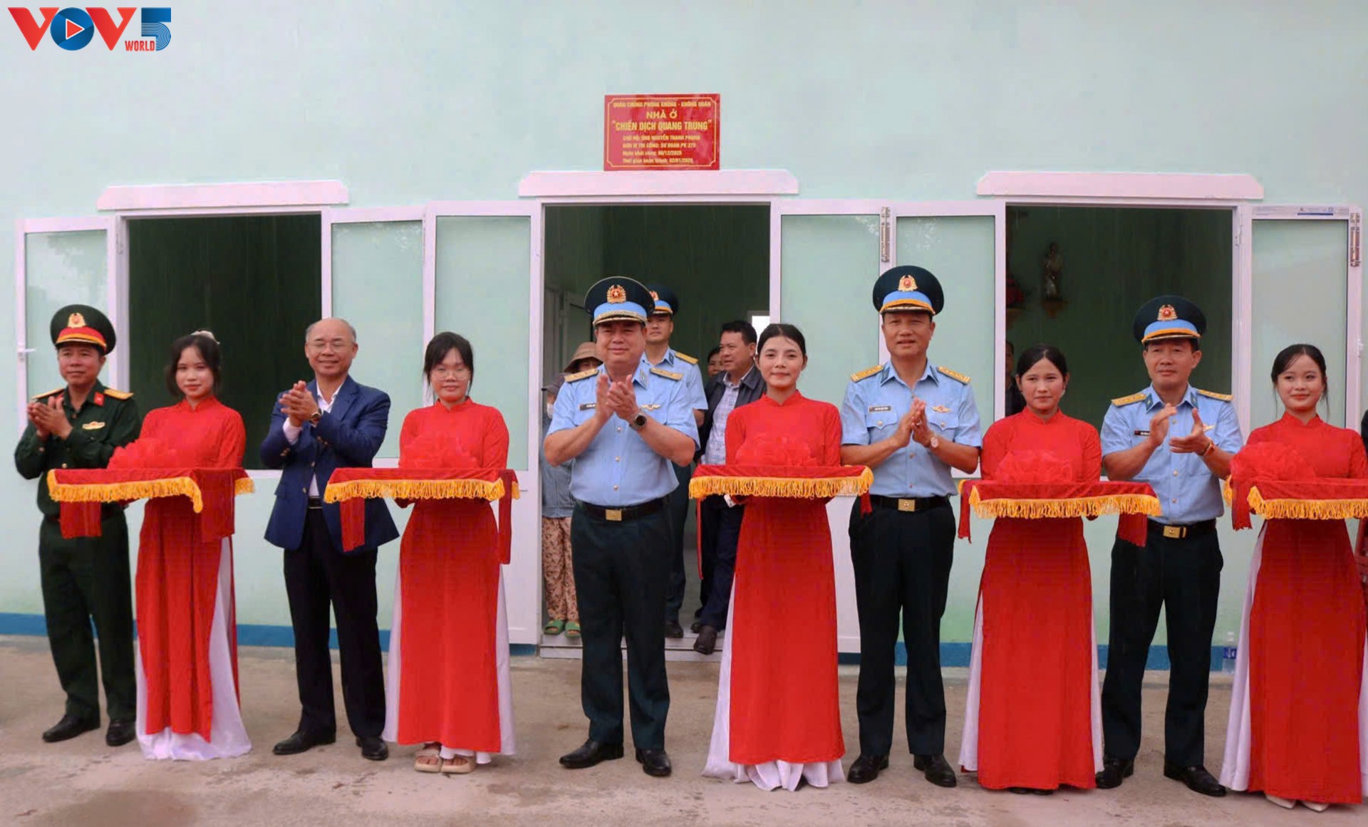 Autoridades de la provincia de Dak Lak y de la Fuerza de Defensa Aérea–Fuerza Aérea participan en el acto protocolario de entrega de viviendas a familias afectadas por las inundaciones en Son Hoa. (Foto: Nam Trang/VOV) |