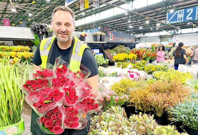 Michael Bagala, florista de Bagala Bros Australia, sostiene ramilletes de rosas rojas en su tienda en el Mercado de Flores de Sídney, el 13 de febrero de 2025. (Foto: Taipei Times) |