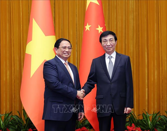 El primer ministro de Vietnam, Pham Minh Chinh, y el presidente del Comité Nacional de la Conferencia Consultiva Política del Pueblo Chino, Wang Huning. (Foto: VNA) |