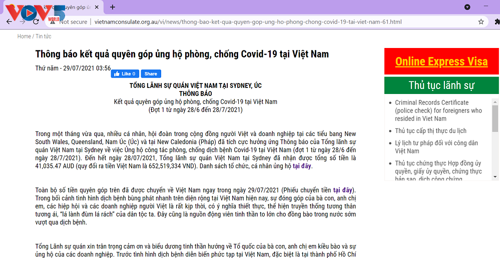 La recaudación de fondos en apoyo al combate contra el covid-19 en Vietnam se publica en el sitio web del Consulado General del pái indochino en Sydney. |