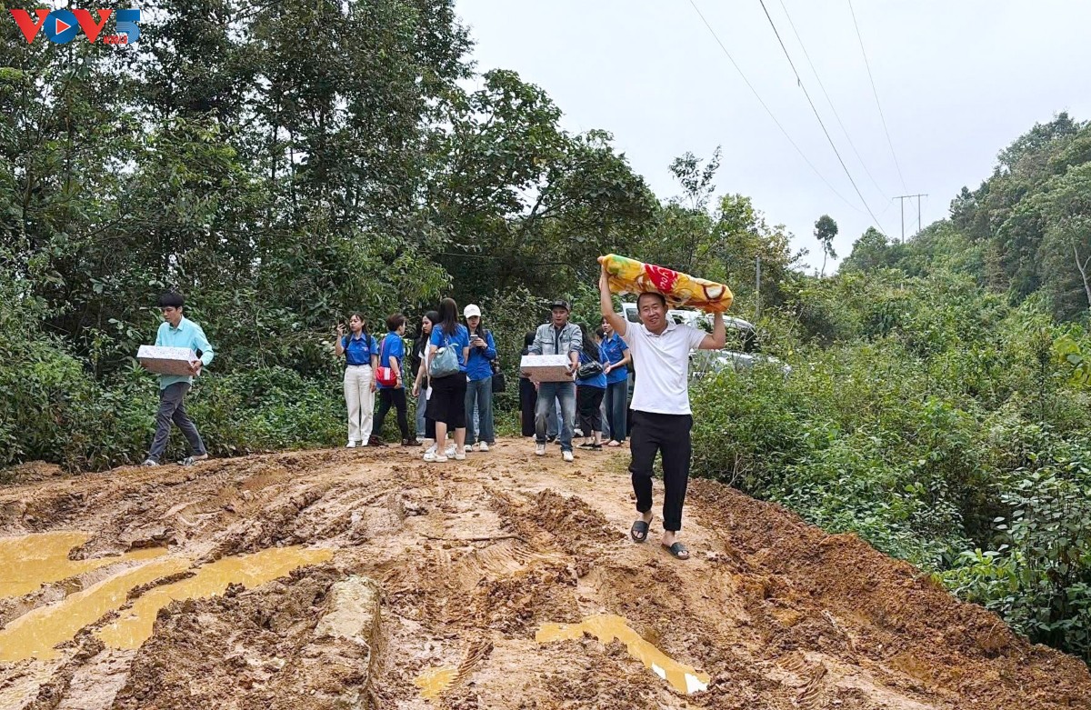 Jóvenes voluntarios suben a la montaña para llevar regalos a niños étnicos. (Foto: Le Hanh/VOV) |