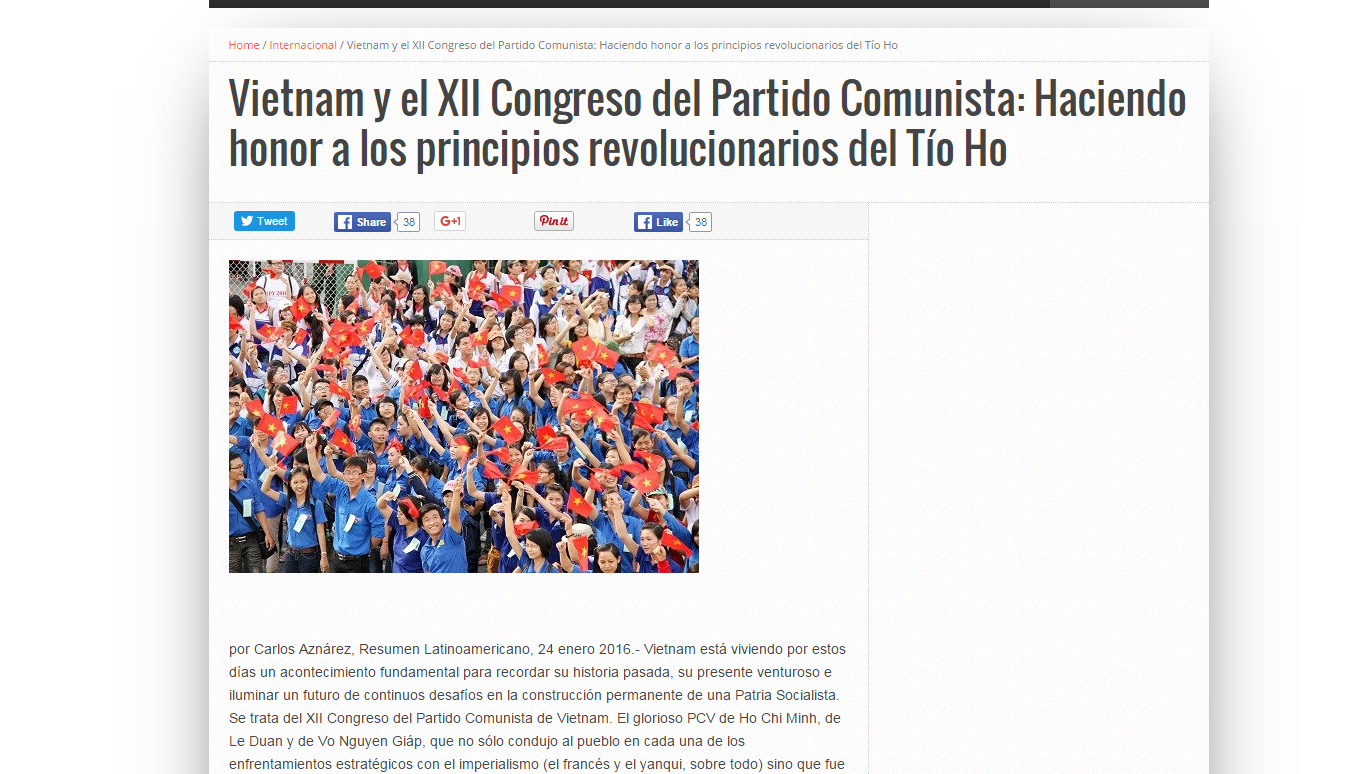 En su artéculo titulado “Vietnam y el XII Congreso del Partido Comunista: Haciendo honor a los principios revolucionarios del Tío Ho”, publicado este lunes, reveló que durante la celebración del evento, los delegados analizarán el plan de continuar impulsando el desarrollo del país y enfrentar los nuevos desafíos de la crisis mundial.