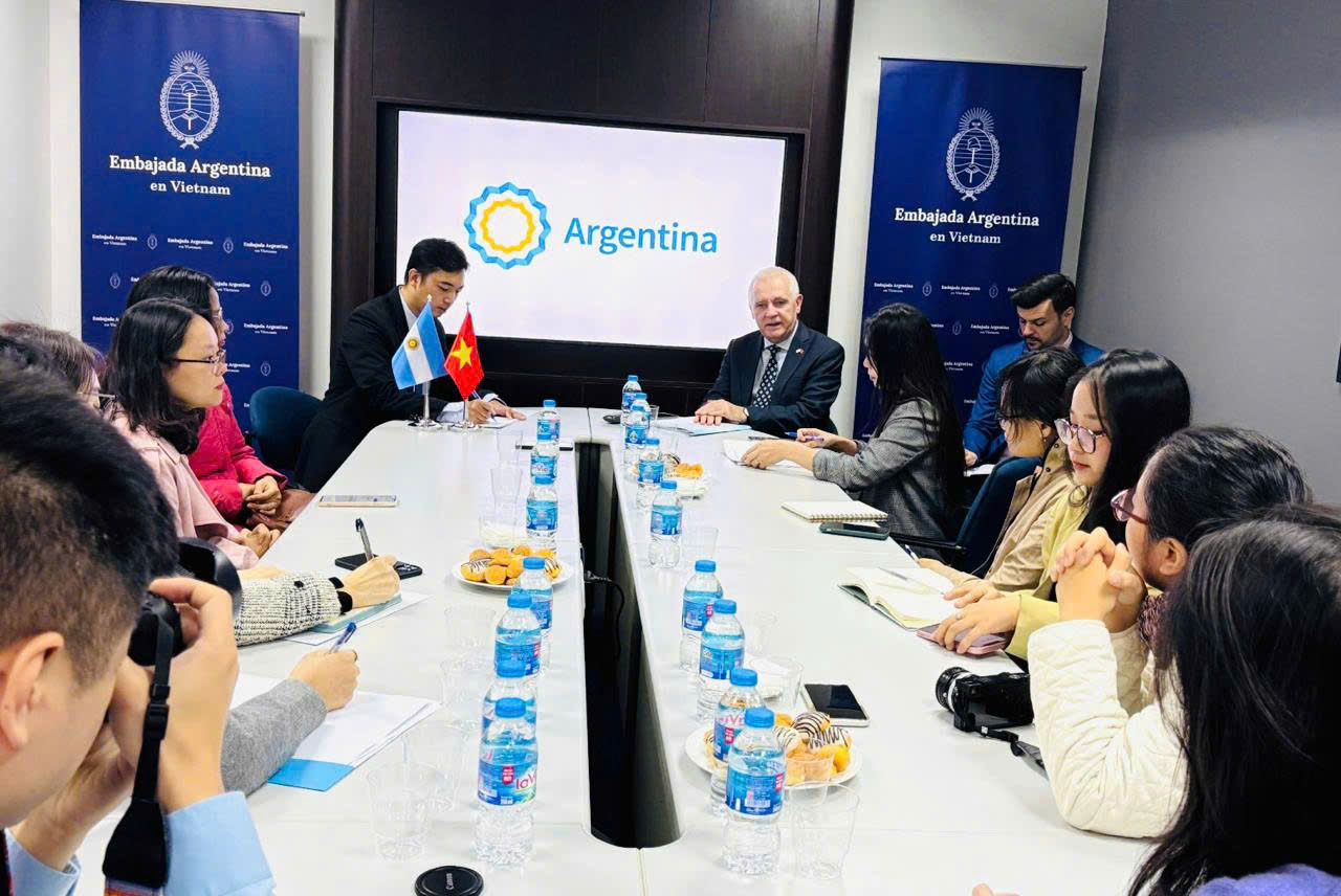 El embajador de Argentina en Vietnam, Marcos A. Bednarski, junto con periodistas en la rueda de prensa del 10 de diciembre en Hanói. |