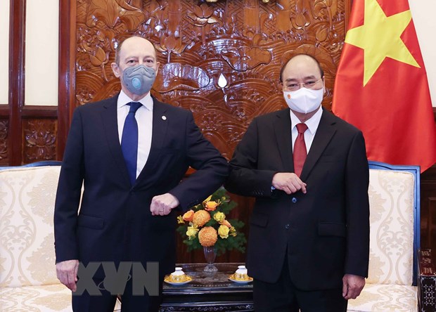 El presidente de Vietnam, Nguyen Xuan Phuc (d), recibe al embajador de Uruguay Raúl Juan Pollak Giampietro. (Foto: VNA) |