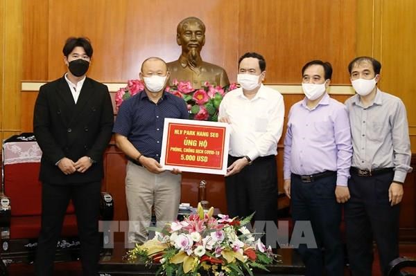 Al recibir la donación, Tran Thanh Man, presidente del Frente de la Patria de Vietnam, agradeció la ayuda financiera otorgada por Hang-seo, así como su contribución al balompié nacional durante los últimos tres años.