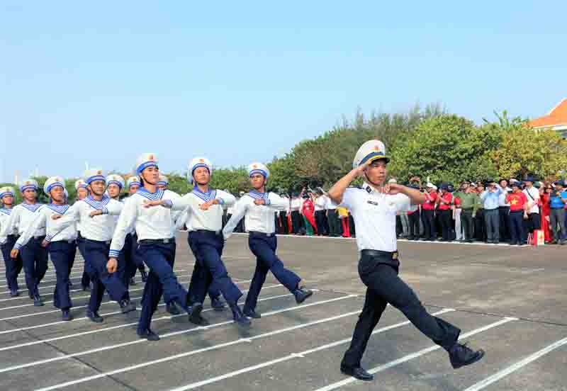 La delegación en un acto de saludo a la bandera nacional y desfile militar en Truong Sa. |