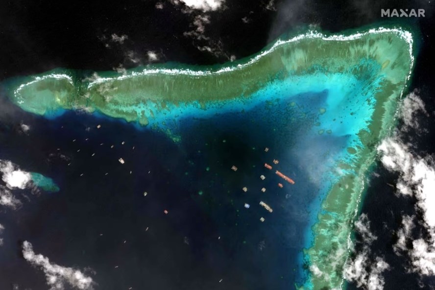 La imagen satelital de marzo de 2021 muestra barcos chinos anclados en el arrecife Ba Dau en el Mar del Este. (Foto: Maxar Technologies/AFP) |