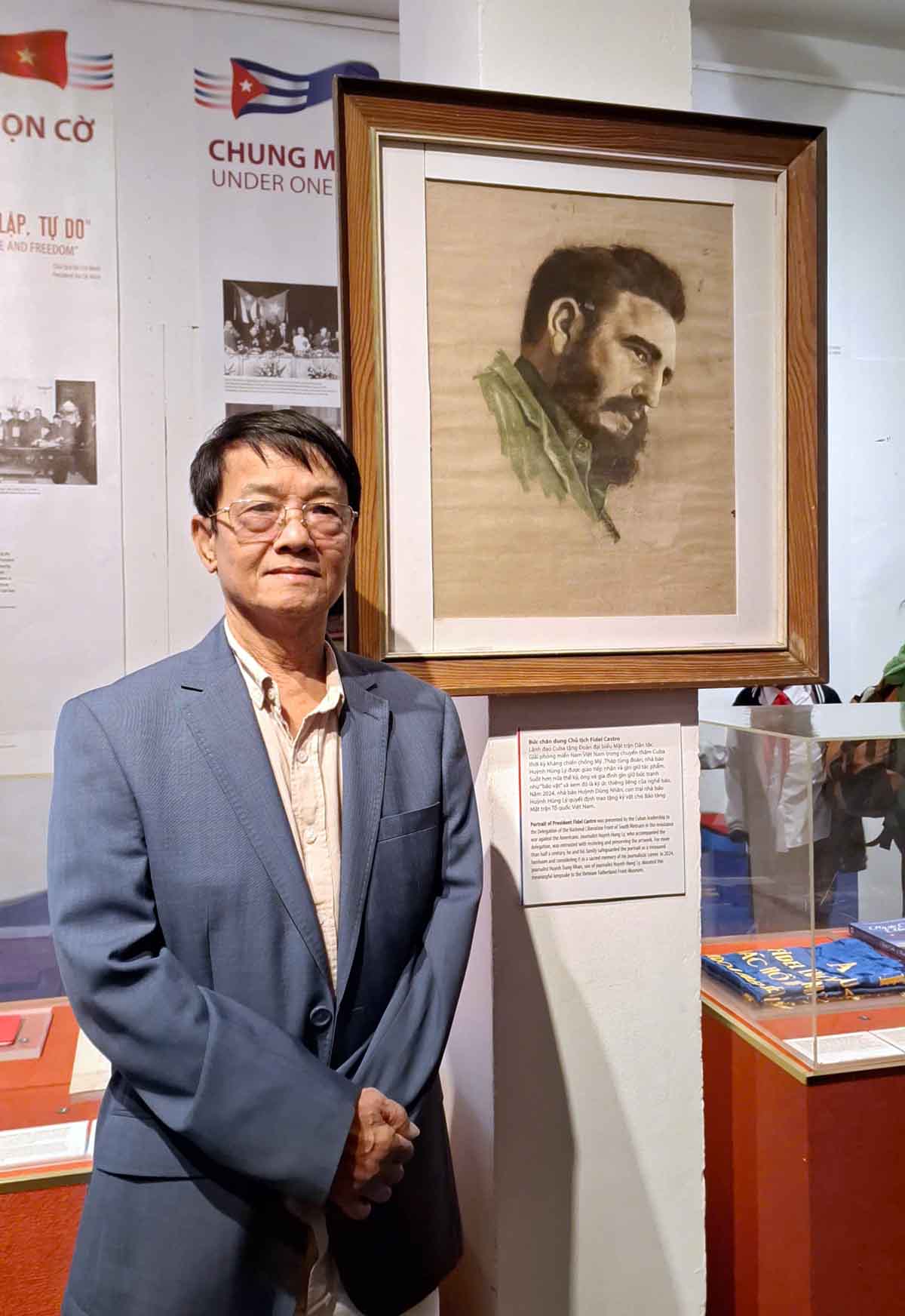 El periodista Huynh Dung Nhan junto al retrato de Fidel Castro donado al Museo de la Mujer de Vietnam. (Foto: Tuan Anh/VOV5) |
