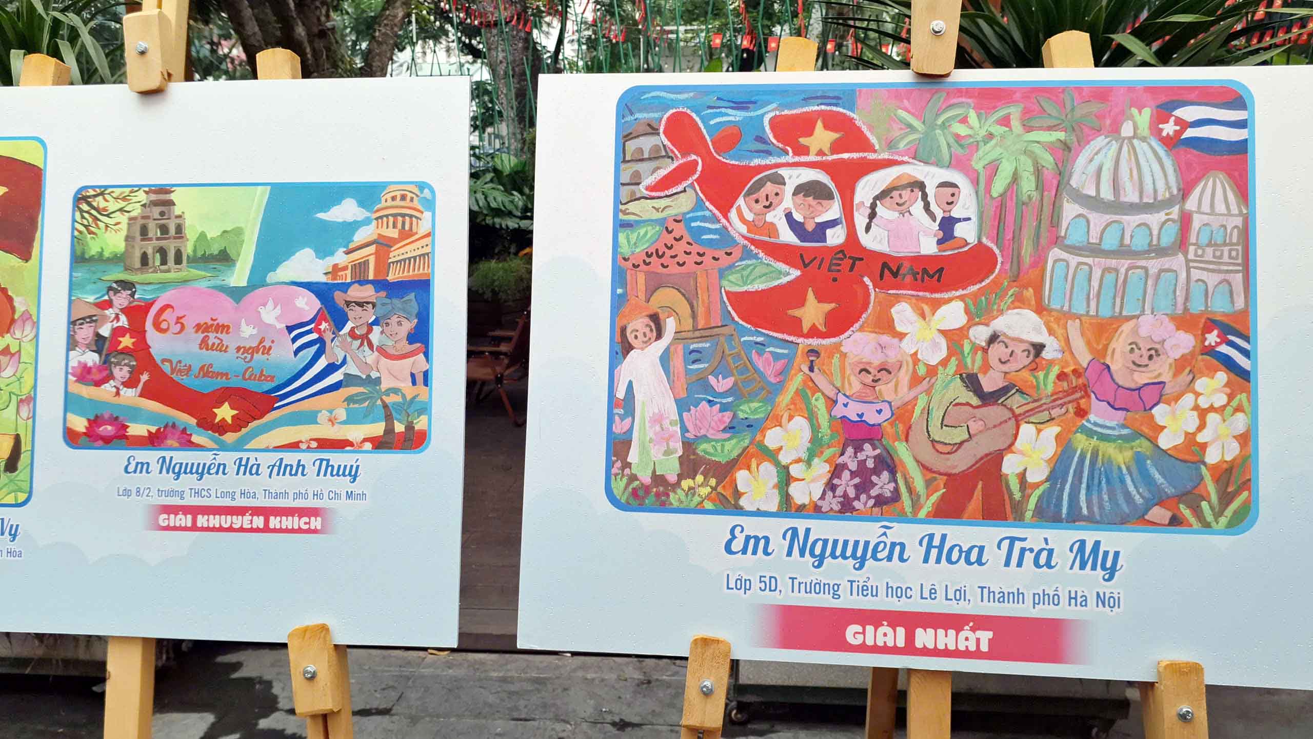 Obras pictóricas realizadas por niños en la exposición. (Foto: Tuan Anh/VOV5) |