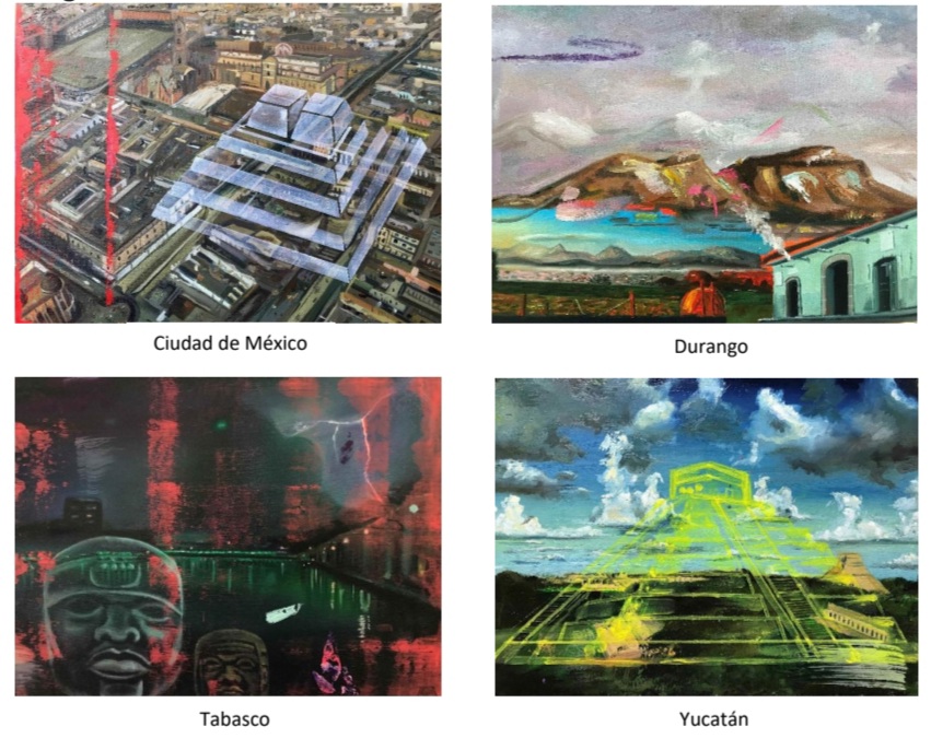 Los 32 óleos de pequeña escala (30x40cm) que se presentarán en la exhibición retratan lugares simbólicos o imaginarios de cada uno de los 32 estados que conforman la nación azteca. La exposición también presenta 3 pendones de gran formato y varios objetos.