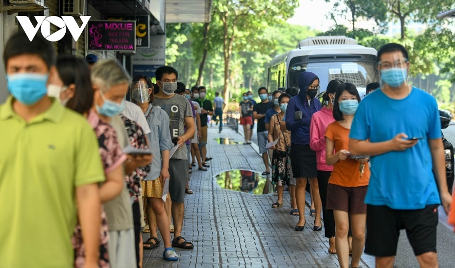 Ciudadanos en el distrito de Hang Mai, Hanói esperan para la toma de muestras de detección. |