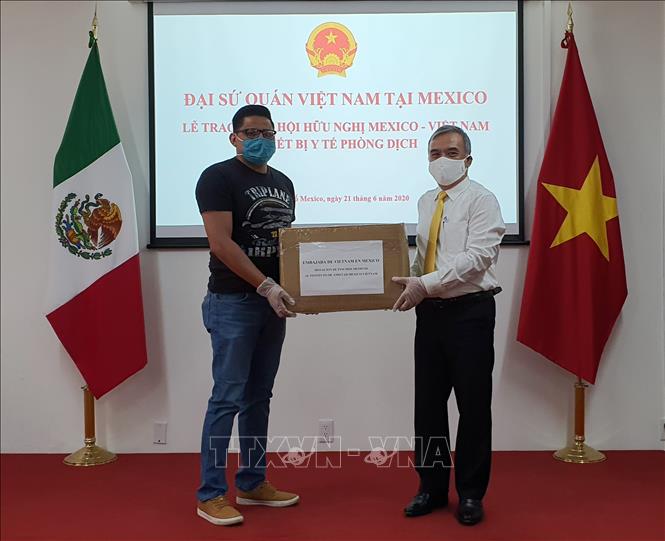 El embajador de Vietnam Nguyen Hoai Duong entrega de modo simbólico la donación de materiales sanitarios al representane del Instituto de Amistad y Cooperación México-Vietnam. (Foto: VNA) |