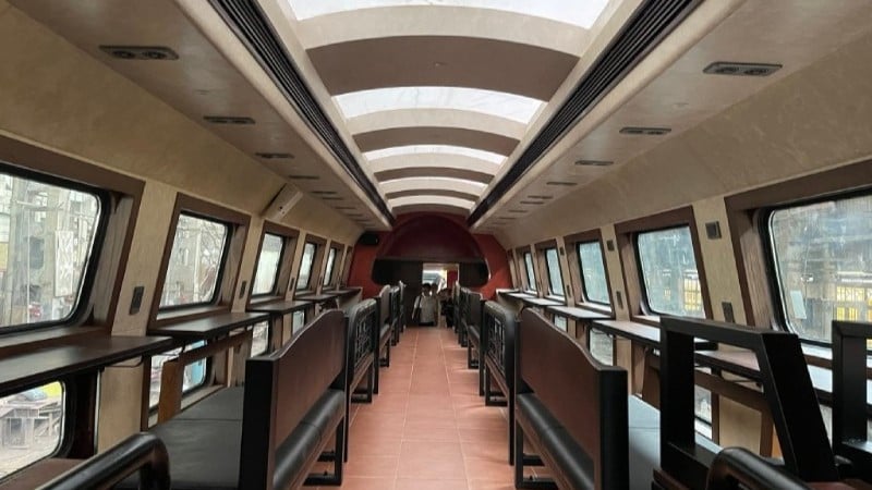 El tren, conocido internacionalmente como el Tren de Hanói, cuenta con amplios ventanales para que los pasajeros disfruten del paisaje y de diversas experiencias durante el viaje.