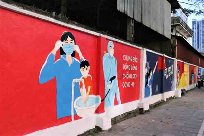 Algunos muros y paredes han sido cubiertos con imágenes de propaganda sobre la lucha contra el covid-19, destacando el protocolo 5K del Ministerio de Salud con el agradecimiento a las fuerzas en primera línea contra este mal. Esto ayuda a que cada ciudadano sea más consciente de sus responsabilidades en la batalla para poner fin a la pandemia.