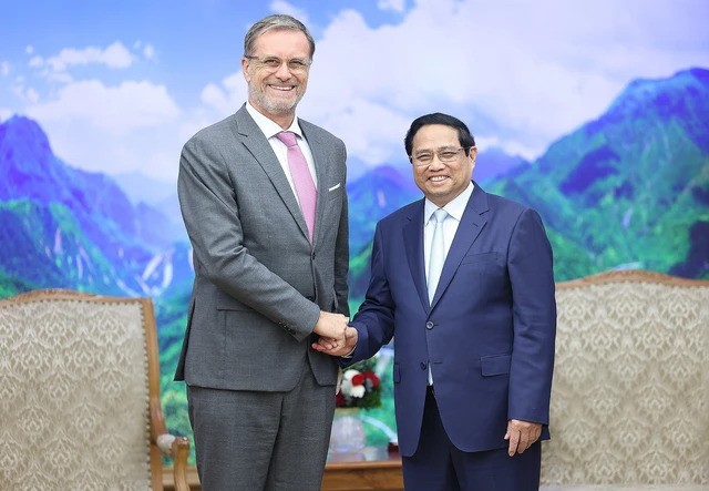 El primer ministro Pham Minh Chinh (d) y el embajador de Francia en Vietnam, Olivier Brochet. (Foto: VNA) |
