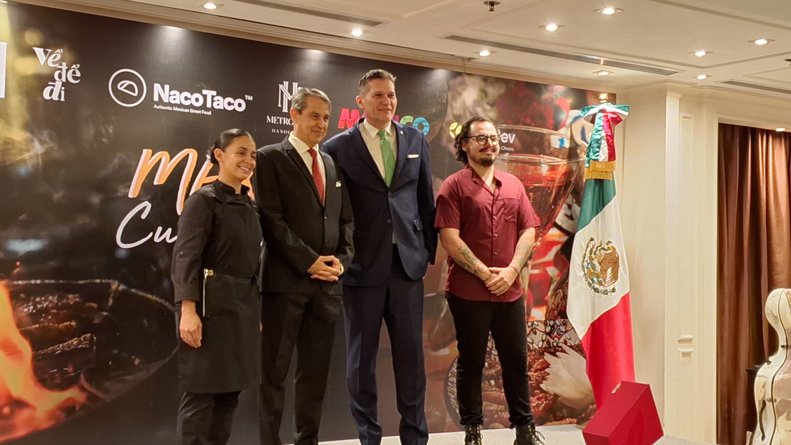 De izquierda a derecha: Chef Gabriela Espinosa, embajador de México en Vietnam, gerente general del hotel Sofitel Legend Metropole Hanoi, y Octavio Muñoz Castillo Jauregui, cofundador del restaurante Naco Taco. (Foto: Tuan Anh/VOV) |