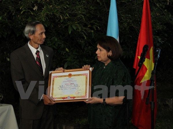 El embajador vietnamita en Argentina, Dang Xuan Dung, concede un sello conmemorativo “Por la paz y amistad entre los pueblos” a la presidenta del ICAV, Poldi Sosa Schimit (Foto: VNA)