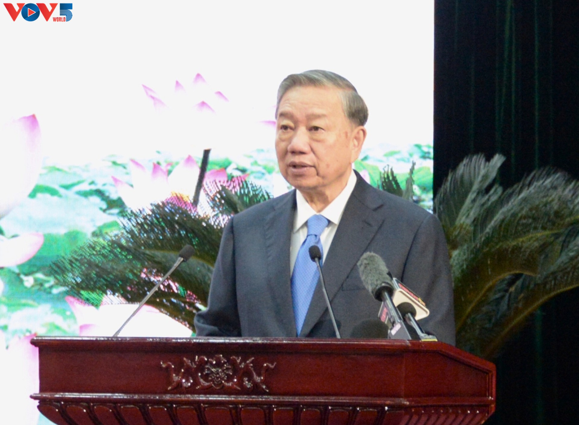 El secretario general del Partido Comunista, To Lam, interviene durante la visita y reunión de trabajo. (Foto: Van Hieu/VOV) |