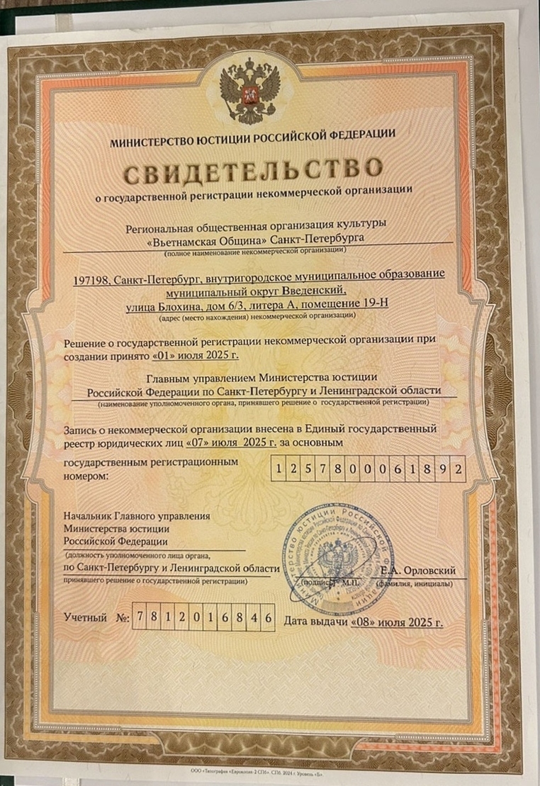 Certificado de registro nacional como organización sociocultural sin ánimo de lucro otorgado a la Comunidad de Vietnam en San Petersburgo. (Foto: VOV) |