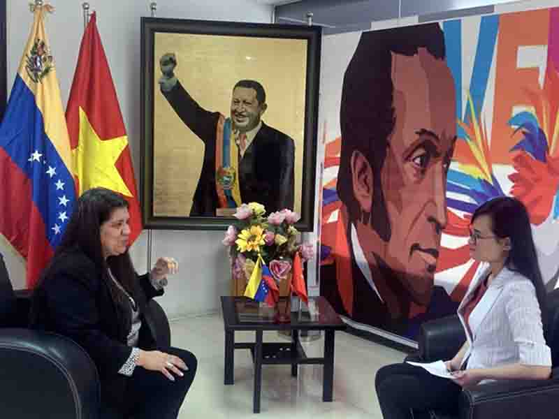 La embajadora de Venezuela en Vietnam, Tatiana Pugh Moreno (i), en la entrevista. (Foto: VNA) |
