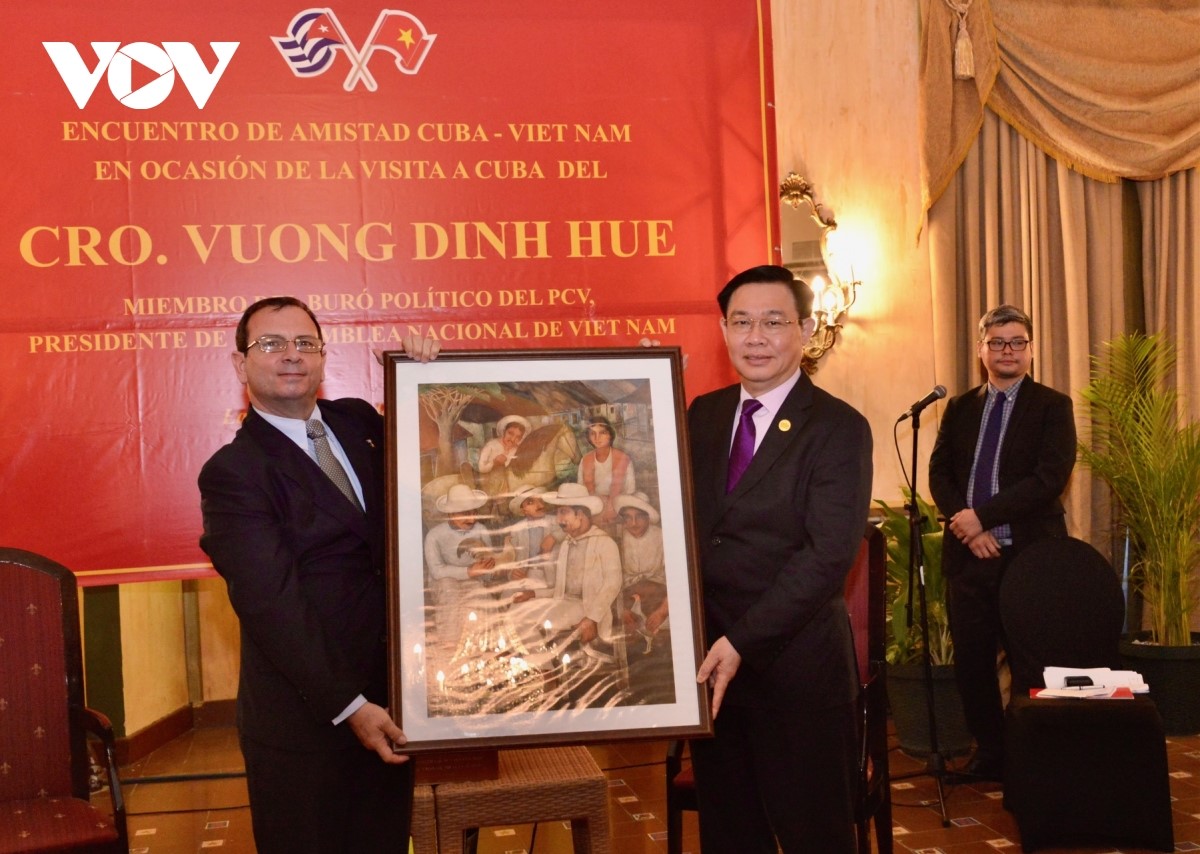 El presidente de la Asamblea Nacional Vuong Dinh Hue recibe un recuerdo del dirigente del Instituto Cubano de Amistad con los Pueblos (ICAP). |