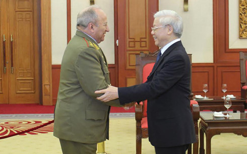![]() El secretario general del PCV, Nguyen Phu Trong, recibe al ministro de las Fuerzas Armadas Revolucionarias de Cuba,Leopoldo Cintra Frías (Foto: VOV)